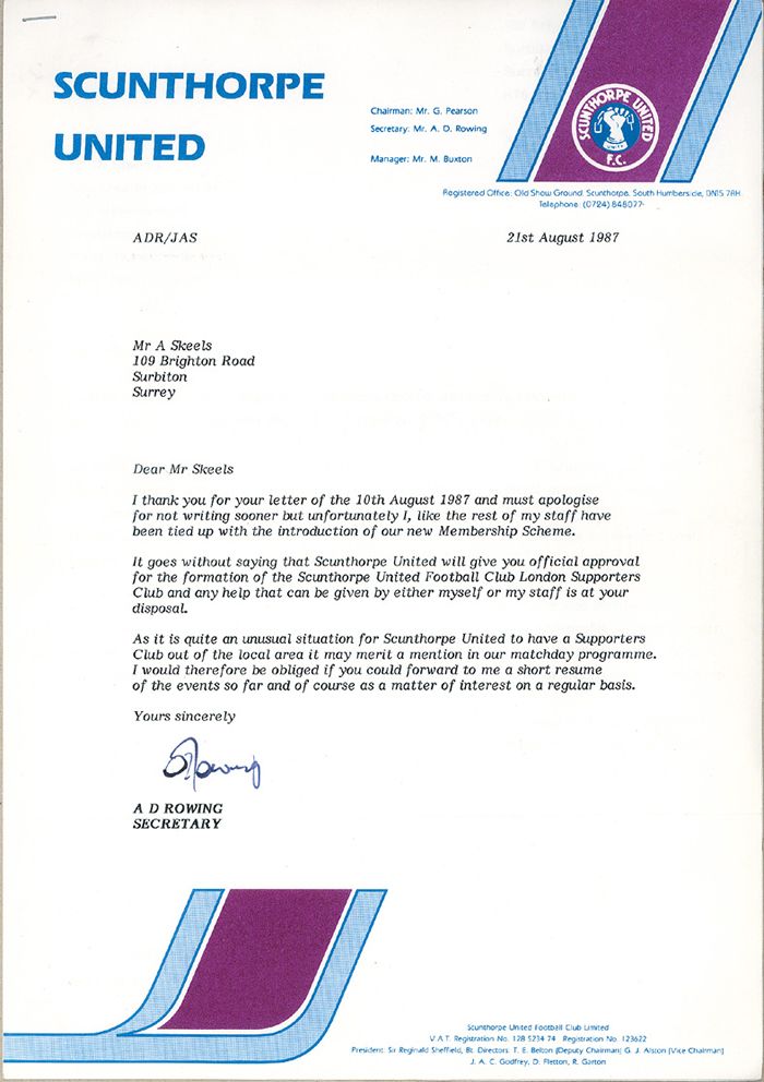 Stupidity, we decided, surely we could get together to split petrol costs, or at least have travelling companions on the train who shared a common interest. Such as watching a mediocre Fourth Division football team lose yet another mundane match somewhere in Middle England. And so, from small acorns... Some months later, it was agreed that we should actively pursue the idea of forming an official London branch. A meeting was organised for the Chandos and there the first committee was 'elected'. Milton Keynes-based Mark Borrill couldn't attend the inaugural get-together - but that didn't prevent the others unanimously voting him in as chairman in his absence! The following week, official approval for the London and South East Supporters' Club was sought from Don Rowing, the secretary of Scunthorpe United FC. In a letter dated August 21st, 1987, permission was granted and SULSESC was officially born. |