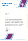Stupidity, we decided, surely we could get together to split petrol costs, or at least have travelling companions on the train who shared a common interest. Such as watching a mediocre Fourth Division football team lose yet another mundane match somewhere in Middle England. And so, from small acorns... Some months later, it was agreed that we should actively pursue the idea of forming an official London branch. A meeting was organised for the Chandos and there the first committee was 'elected'. Milton Keynes-based Mark Borrill couldn't attend the inaugural get-together - but that didn't prevent the others unanimously voting him in as chairman in his absence! The following week, official approval for the London and South East Supporters' Club was sought from Don Rowing, the secretary of Scunthorpe United FC. In a letter dated August 21st, 1987, permission was granted and SULSESC was officially born. |