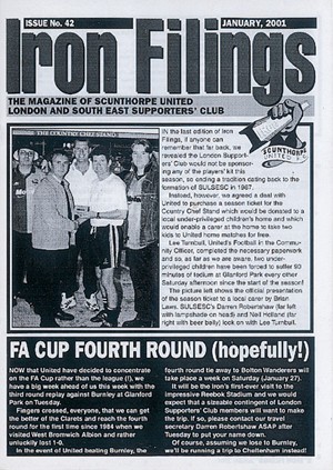 CLEARING the backlog of match reports, 15 pages of this 28-page edition bring members up to date with the Iron’s latest mishaps, stretching from a 3-2 defeat at Rochdale on August 26, 2000, to the 1-1 draw at Lincoln on Boxing Day. The front cover picture shows SULSESC members Darren Robertshaw and Neil Holland making a presentation of a season ticket to a local under-privileged children’s home which would be used by a carer to take two kids to a match at Glanford Park free of charge.