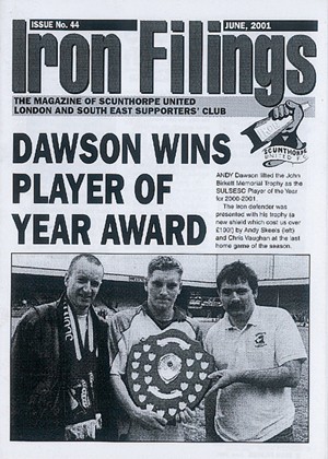 THE front cover shows Andy Dawson receiving his Player of the Year award from Andy Skeels and Chris Vaughan while, inside, this 20-page issue includes cuttings from FourFourTwo, which features a United fan “as Scunthorpe’s gaffer for the day”; from When Saturday Comes, looking at football in Lincolnshire; and from the late, but not really lamented Football League Review, and their October, 1966, ‘clubcall on Scunthorpe’.