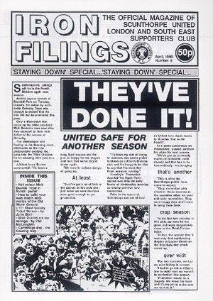 A ‘STAYING DOWN’ special issue as defeat at Blundell Park effectively ended United’s promotion hopes for another season. Cuttings included a piece from the now defunct Sunday Correspondent on United’s move to Glanford Park in the light of the Taylor Report, plus coverage in the Scunthorpe Evening Telegraph of the London branch, and the back page featured ‘Mad Mick’s Motor Mart’, with such top buys as ‘Mark Lillis: High mileage, continually breaking down.’